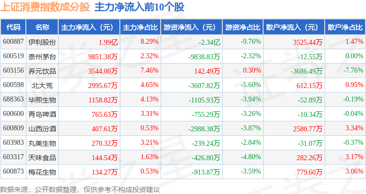 资金流向方面,上证消费(000036)指数成份股当日主力资金净流入合计1.33亿元,游资资金净流出合计4.88亿元,散户资金净流入合计3.54亿元。成份股资金流向详情见下表: