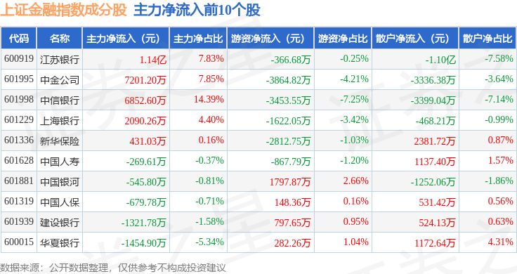 资金流向方面,上证金融(000038)指数成份股当日主力资金净流出合计58.66亿元,游资资金净流入合计30.67亿元,散户资金净流入合计27.99亿元。成份股资金流向详情见下表: