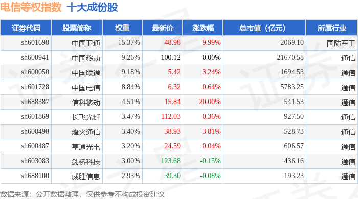 证券之星消息,1月9日,电信等权(000078)指数报收于3896.72点,涨4.2%,成交567.6亿元,换手率1.62%。当日该指数成份股中,上涨的有30家,信科移动以20.0%的涨幅领涨,下跌的有2家,剑桥科技以0.15%的跌幅领跌。