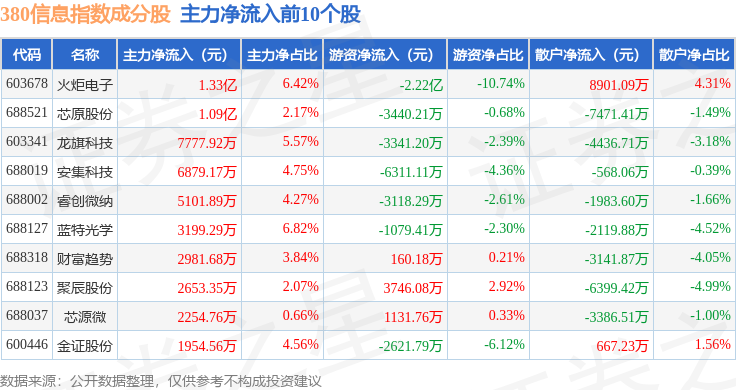 资金流向方面,380信息(000111)指数成份股当日主力资金净流出合计15.63亿元,游资资金净流入合计3951.35万元,散户资金净流入合计15.24亿元。成份股资金流向详情见下表: