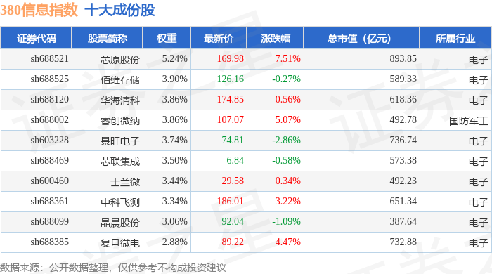 380信息(000111)指数十大成份股详情如下: