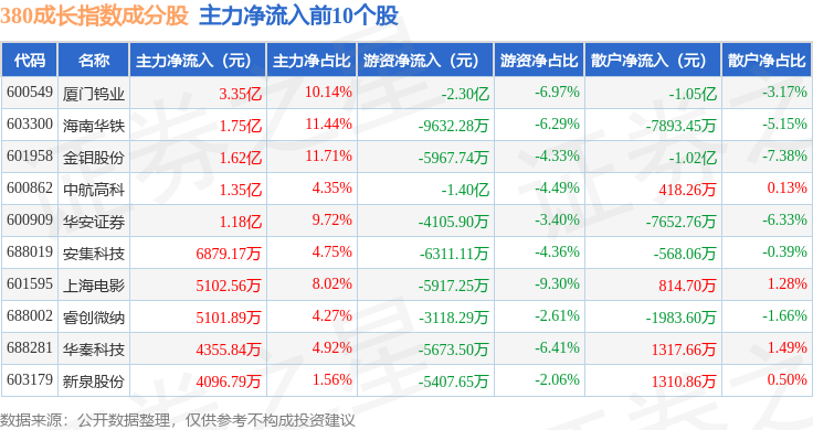 资金流向方面,380成长(000117)指数成份股当日主力资金净流出合计9.44亿元,游资资金净流出合计8.43亿元,散户资金净流入合计17.87亿元。成份股资金流向详情见下表: