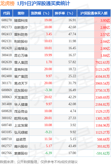 龙虎榜中有沪股通/深股通专用席位(北向资金)现身的个股共29家,其中臻镭科技以净买入3.95亿元排名第一。详情见下表: