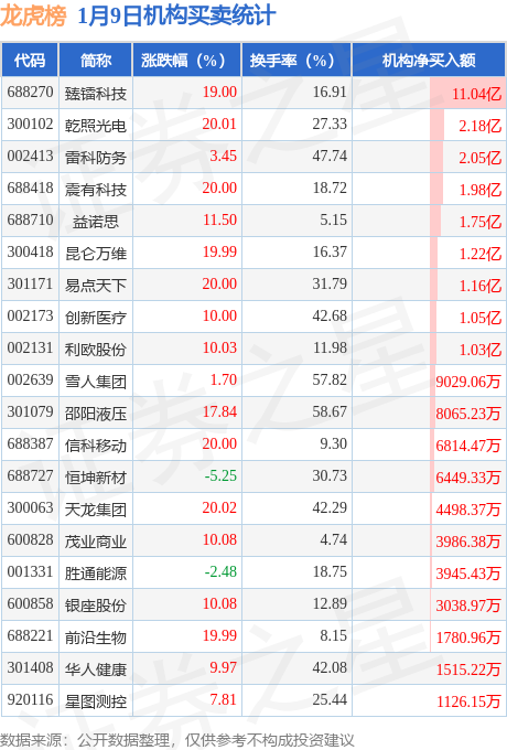 当日公布的交易所龙虎榜中有机构专用席位现身的个股共41家,其中臻镭科技以净买入11.04亿元排名第一。详情见下表: