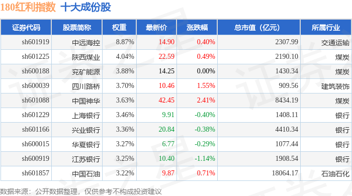 证券之星消息,1月9日,180红利(000149)指数报收于4009.89点,涨0.05%,成交457.6亿元,换手率0.25%。当日该指数成份股中,上涨的有10家,中国神华以2.41%的涨幅领涨,下跌的有17家,中国平安以1.96%的跌幅领跌。