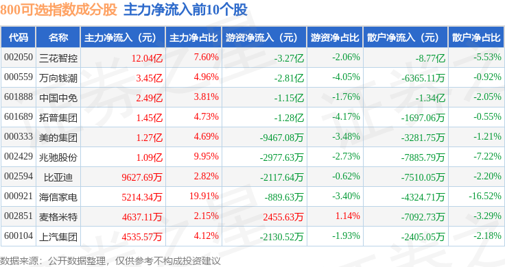 资金流向方面,800可选(000931)指数成份股当日主力资金净流入合计15.21亿元,游资资金净流出合计12.81亿元,散户资金净流出合计2.4亿元。成份股资金流向详情见下表: