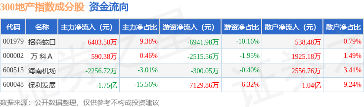 资金流向方面,300地产(000952)指数成份股当日主力资金净流出合计1.28亿元,游资资金净流出合计2627.72万元,散户资金净流入合计1.54亿元。成份股资金流向详情见下表: