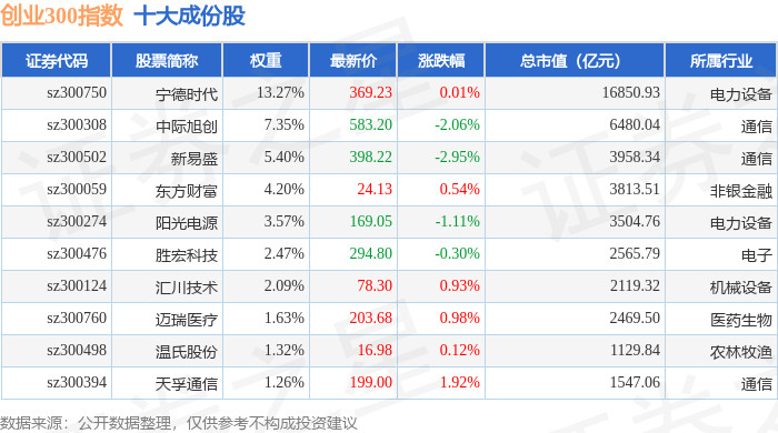 创业300(399012)指数十大成份股详情如下:
