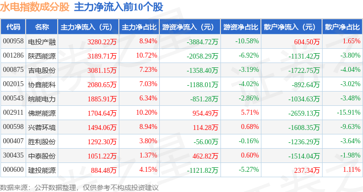 资金流向方面,水电指数(399234)成份股当日主力资金净流出合计2.48亿元,游资资金净流出合计995.16万元,散户资金净流入合计2.58亿元。成份股资金流向详情见下表: