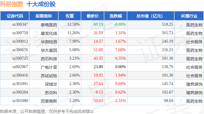 证券之星消息,1月9日,科研指数(399243)报收于1570.62点,涨1.56%,成交189.83亿元,换手率3.67%。当日该指数成份股中,上涨的有50家,泓博医药以19.99%的涨幅领涨,下跌的有15家,谱尼测试以8.77%的跌幅领跌。