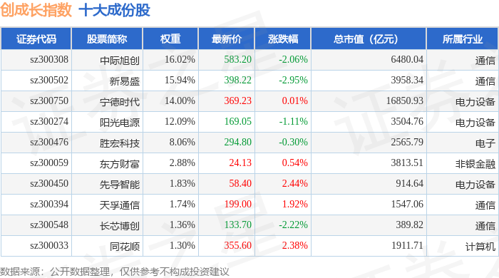创成长(399296)指数十大成份股详情如下:
