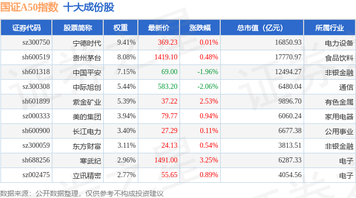 国证A50(399310)指数十大成份股详情如下: