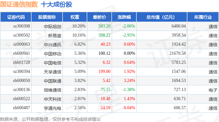 证券之星消息,1月9日,国证通信(399389)指数报收于8706.72点,涨1.1%,成交2063.28亿元,换手率3.3%。当日该指数成份股中,上涨的有55家,信科移动以20.0%的涨幅领涨,下跌的有14家,新易盛以2.95%的跌幅领跌。