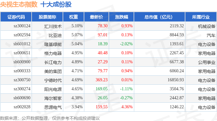 证券之星消息,1月9日,央视生态(399556)指数报收于2937.92点,涨0.15%,成交1078.42亿元,换手率1.47%。当日该指数成份股中,上涨的有31家,思源电气以4.36%的涨幅领涨,下跌的有18家,通威股份以3.83%的跌幅领跌。