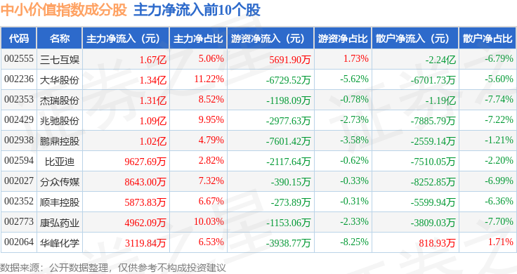 资金流向方面,中小价值(399604)指数成份股当日主力资金净流出合计4.91亿元,游资资金净流出合计4.68亿元,散户资金净流入合计9.59亿元。成份股资金流向详情见下表: