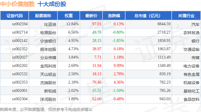 证券之星消息,1月9日,中小价值(399604)指数报收于2116.43点,涨0.87%,成交652.49亿元,换手率1.44%。当日该指数成份股中,上涨的有76家,金风科技以9.99%的涨幅领涨,下跌的有23家,利尔化学以2.79%的跌幅领跌。