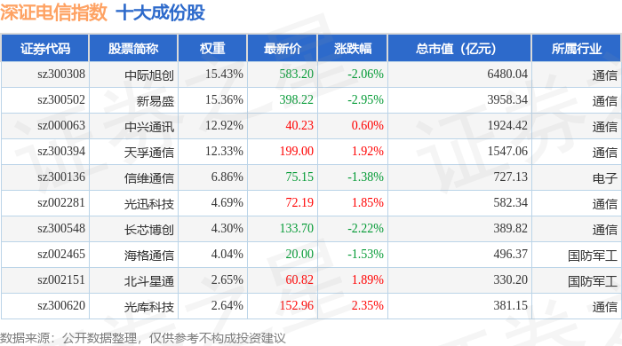 证券之星消息,1月9日,深证电信(399621)指数报收于13213.48点,跌0.19%,成交1118.46亿元,换手率8.98%。当日该指数成份股中,上涨的有13家,中瓷电子以3.7%的涨幅领涨,下跌的有7家,新易盛以2.95%的跌幅领跌。