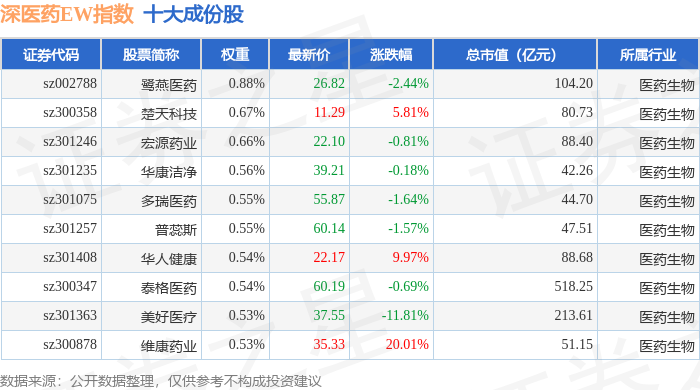 证券之星消息,1月9日,深医药EW(399676)指数报收于4015.27点,涨1.4%,成交771.97亿元,换手率3.08%。当日该指数成份股中,上涨的有185家,维康药业以20.01%的涨幅领涨,下跌的有33家,美好医疗以11.81%的跌幅领跌。