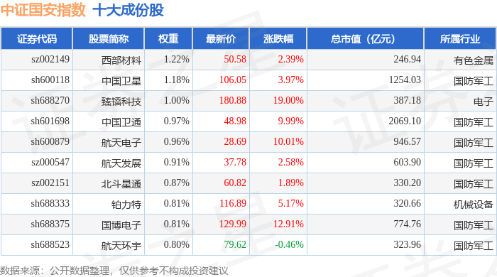 证券之星消息,1月9日,中证国安(399813)指数报收于9095.09点,涨3.61%,成交3472.18亿元,换手率7.1%。当日该指数成份股中,上涨的有139家,臻镭科技以19.0%的涨幅领涨,下跌的有12家,北方导航以1.85%的跌幅领跌。