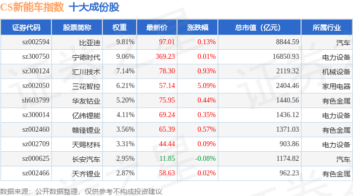 资金流向方面,CS新能车(399976)指数成份股当日主力资金净流出合计9.34亿元,游资资金净流出合计6.72亿元,散户资金净流入合计15.85亿元。成份股资金流向详情见下表: