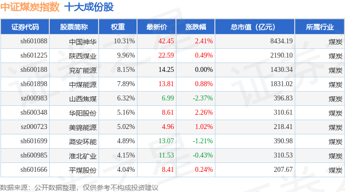 证券之星消息,1月9日,中证煤炭(399998)指数报收于2103.86点,涨0.39%,成交101.06亿元,换手率1.16%。当日该指数成份股中,上涨的有19家,中国神华以2.41%的涨幅领涨,下跌的有10家,大有能源以3.23%的跌幅领跌。
