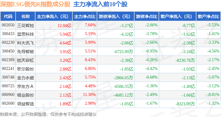 资金流向方面,深指ESG领先R(470029)指数成份股当日主力资金净流出合计45.38亿元,游资资金净流入合计1.45亿元,散户资金净流入合计43.93亿元。成份股资金流向详情见下表: