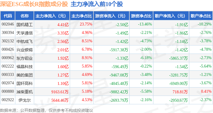 资金流向方面,深证ESG成长R(470060)指数成份股当日主力资金净流出合计39.84亿元,游资资金净流入合计16.3亿元,散户资金净流入合计23.54亿元。成份股资金流向详情见下表: