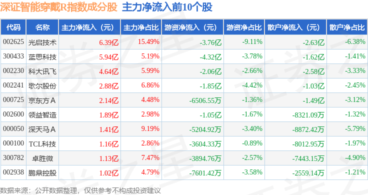 资金流向方面,深证智能穿戴R(470074)指数成份股当日主力资金净流出合计7.59亿元,游资资金净流出合计9.07亿元,散户资金净流入合计16.66亿元。成份股资金流向详情见下表: