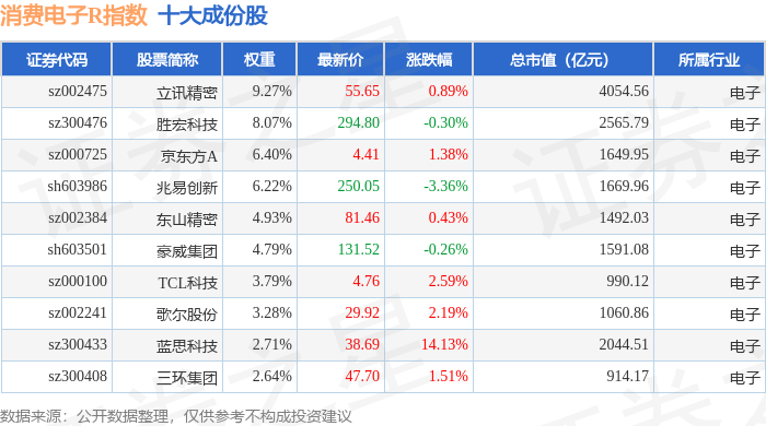 消费电子R(480030)指数十大成份股详情如下: