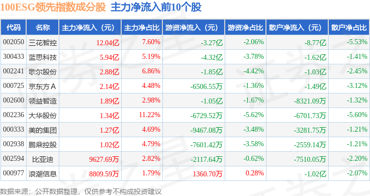 资金流向方面,100ESG领先(970030)指数成份股当日主力资金净流出合计9.54亿元,游资资金净流入合计6.21亿元,散户资金净流入合计3.33亿元。成份股资金流向详情见下表: