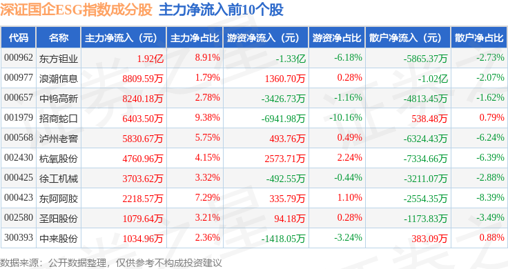 资金流向方面,深证国企ESG(970055)指数成份股当日主力资金净流出合计4.09亿元,游资资金净流出合计1.42亿元,散户资金净流入合计5.51亿元。成份股资金流向详情见下表: