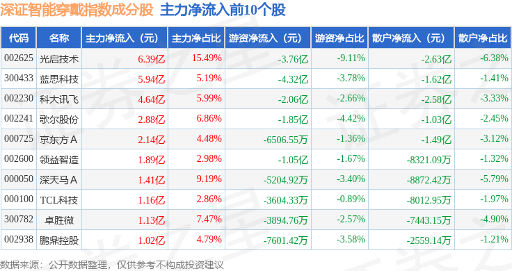 资金流向方面,深证智能穿戴(970074)指数成份股当日主力资金净流出合计7.59亿元,游资资金净流出合计9.07亿元,散户资金净流入合计16.66亿元。成份股资金流向详情见下表: