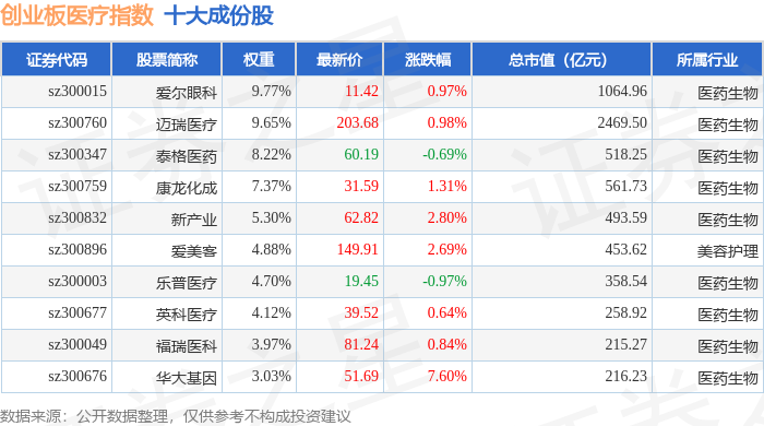 证券之星消息,1月9日,创业板医疗(970082)指数报收于4002.22点,涨1.44%,成交275.96亿元,换手率3.22%。当日该指数成份股中,上涨的有41家,迪安诊断以20.0%的涨幅领涨,下跌的有9家,美好医疗以11.81%的跌幅领跌。