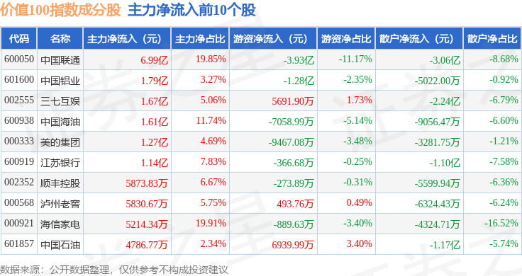 资金流向方面,价值100(980081)指数成份股当日主力资金净流入合计8.55亿元,游资资金净流出合计3.85亿元,散户资金净流出合计4.7亿元。成份股资金流向详情见下表: