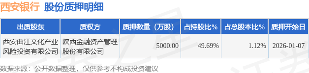 证券之星消息,西安银行(600928)1月9日公开信息显示,股东西安曲江文化产业风险投资有限公司向陕西金融资产管理股份有限公司合计质押5000.0万股,占总股本1.12%。质押详情见下表: