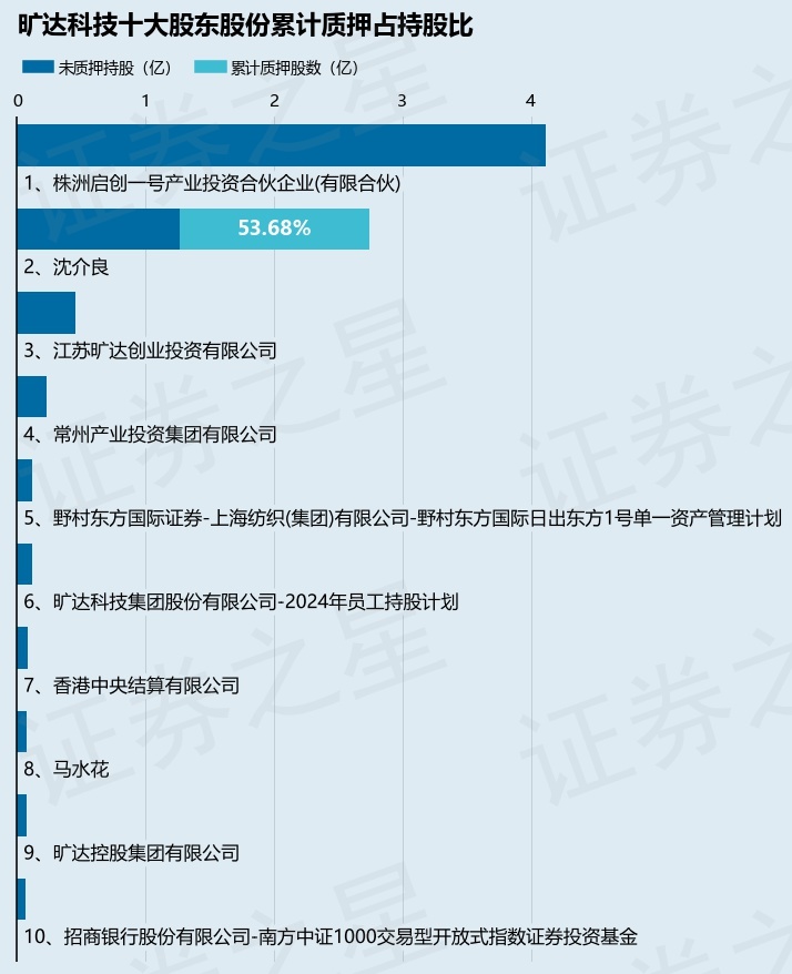 截止本公告日,股东沈介良已累计质押股份1.47亿股,占其持股总数的53.68%。本次质押后旷达科技十大股东的累计质押股份占持股比例(占持股比例的计算以公司最新一期财务报表公布的十大股东的持股总数为基准)见下图: