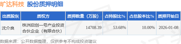 证券之星消息,旷达科技(002516)1月9日公开信息显示,股东沈介良向株洲启创一号产业投资合伙企业(有限合伙)合计质押1.47亿股,占总股本10.0%。质押详情见下表: