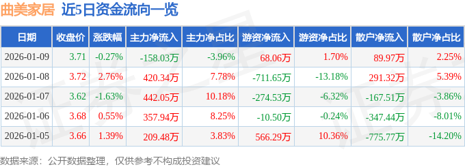 证券之星消息,截至2026年1月9日收盘,曲美家居(603818)报收于3.71元,下跌0.27%,换手率1.57%,成交量10.81万手,成交额3992.94万元。