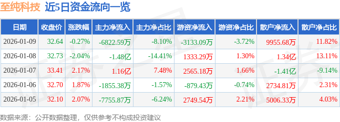 证券之星消息,截至2026年1月9日收盘,至纯科技(603690)报收于32.64元,下跌0.27%,换手率6.76%,成交量25.9万手,成交额8.42亿元。