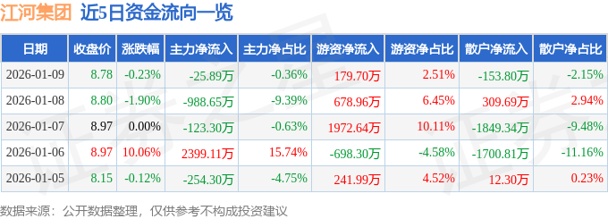 1月9日的资金流向数据方面,主力资金净流出25.89万元,占总成交额0.36%,游资资金净流入179.7万元,占总成交额2.51%,散户资金净流出153.8万元,占总成交额2.15%。