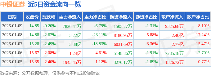 证券之星消息,截至2026年1月9日收盘,中银证券(601696)报收于14.85元,下跌0.2%,换手率2.8%,成交量77.73万手,成交额11.52亿元。