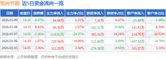 证券之星消息,截至2026年1月9日收盘,恒尚节能(603137)报收于14.1元,下跌0.07%,换手率1.49%,成交量1.1万手,成交额1540.89万元。