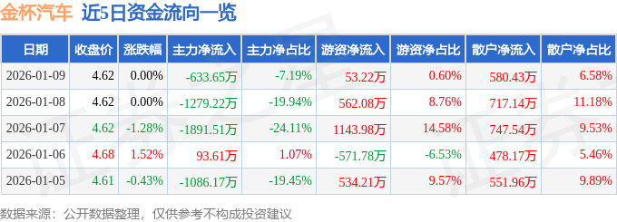 证券之星消息,截至2026年1月9日收盘,金杯汽车(600609)报收于4.62元,上涨0.0%,换手率1.46%,成交量19.09万手,成交额8817.07万元。