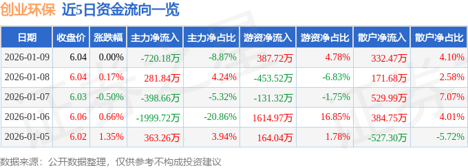 证券之星消息,截至2026年1月9日收盘,创业环保(600874)报收于6.04元,上涨0.0%,换手率1.09%,成交量13.43万手,成交额8117.04万元。