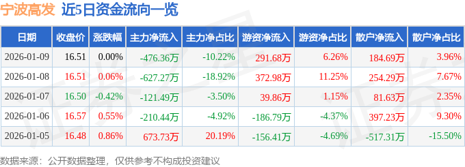 证券之星消息,截至2026年1月9日收盘,宁波高发(603788)报收于16.51元,上涨0.0%,换手率1.27%,成交量2.82万手,成交额4661.77万元。