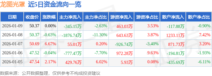 1月9日的资金流向数据方面,主力资金净流出345.15万元,占总成交额2.63%,游资资金净流入463.03万元,占总成交额3.53%,散户资金净流出117.88万元,占总成交额0.9%。