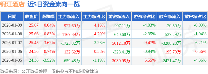 证券之星消息,截至2026年1月9日收盘,锦江酒店(600754)报收于25.67元,上涨0.04%,换手率0.97%,成交量8.77万手,成交额2.25亿元。