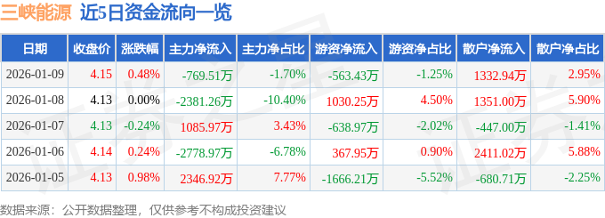 证券之星消息,截至2026年1月9日收盘,三峡能源(600905)报收于4.15元,上涨0.48%,换手率0.38%,成交量109.09万手,成交额4.52亿元。