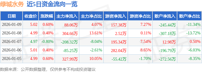 证券之星消息,截至2026年1月9日收盘,绿城水务(601368)报收于5.02元,上涨0.6%,换手率0.49%,成交量4.32万手,成交额2163.87万元。