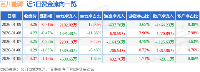 证券之星消息,截至2026年1月9日收盘,百川能源(600681)报收于4.26元,上涨0.71%,换手率3.07%,成交量41.14万手,成交额1.75亿元。